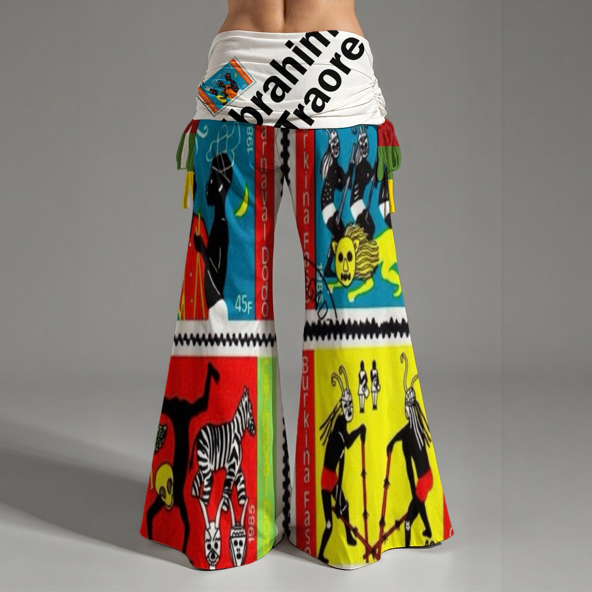 Celebrate history and style with these iconic high waist wide-leg pants from the House’s Heritage Goddi X Ibrahim Traoré Collection. Inspired by Burkina Faso’s rich cultural legacy, these pants honor the 1985 issuance of the $0.25 stamp that commemorates Ouagadougou, the vibrant capital city formerly known as Upper Volta. The stamp, issued a year after the country’s renaming, features the word "carnival" and pays tribute to the lively spirit and resilience of Burkina Faso.